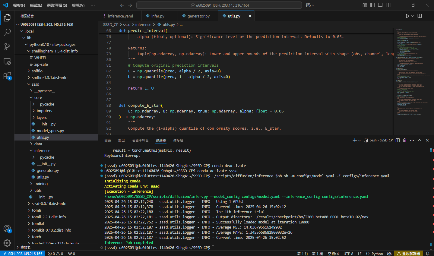 這裡也需要修改,讓缺值部分填入 0 ,使得程式碼能進行填補( NA 無法進行數值運算,會報錯)。此段程式碼位於 /SSSD_CP-main/sssd/inference/generator.py 。